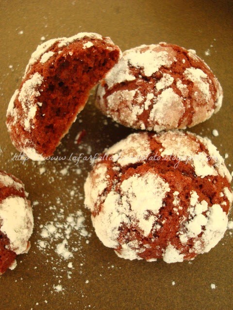 Parliamo di questi cookies che di fare resoconti e punti della situazione quest'anno non mi va, troppe cose belle e brutte successe e va bene così. Io fissata con la red velvet (fatta anche per i miei 30 anni), sono stata folgorata da questi. Rossi e con il crackles meglio di così :D, li ho studiati per benino per farli venire bene al primo tentantivo, e ci sono riuscita!!! Presa da un blog americano (perdonatemi non riesco più a trovarlo)...da provare...stesso sapore della red velvet ma fatta biscotto!