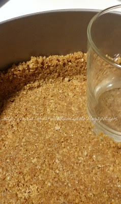 Tritare i biscotti con un tritatutto e mescolarli con lo zucchero di canna e il burro fuso. Compattare questa "sabbia" in una teglia con cerniera da 23cm (io uso quella dell'ikea ;D). Se utilizzate un bicchiere al posto del cucchiaio, vi semplificherete la vita. Alzate la sabbia fino ai bordi. Mettete in frigo per tutto il tempo della preparazione della crema.